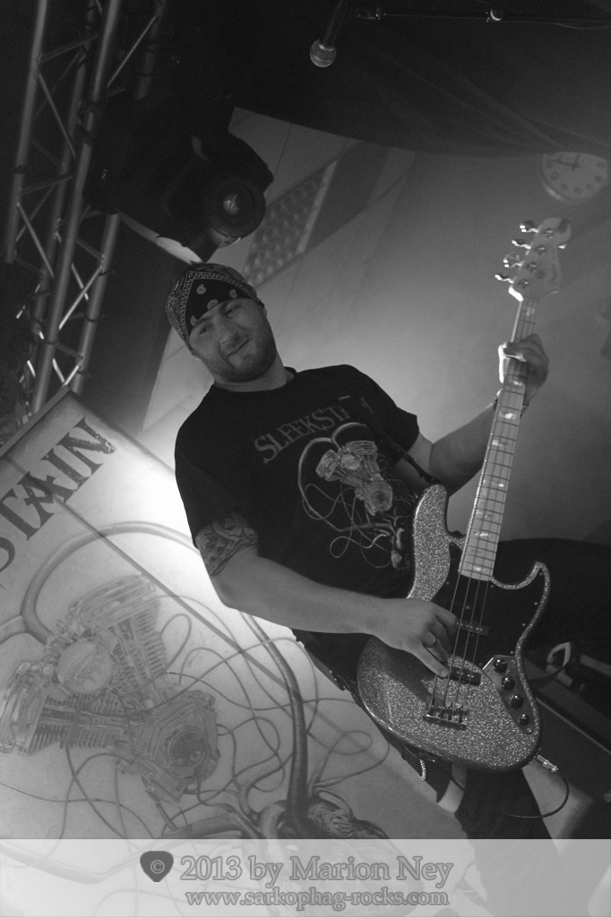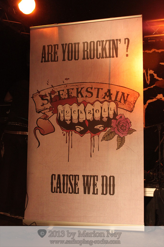 Die vier Jungs der 2009 gegründeten französischen Gruppe kamen auf die Bühne, erledigten zuerst noch einige „Bauarbeiten“ und einen kurzen Soundcheck. Der Umbau dauerte nicht lange, denn alle Bands nutzten das selbe Drum-Set. Im Hintergrund prangte bereits das Sister Logo, Sleekstain setzten was anderes ein. Auf der Bühne standen jetzt links und rechts zwei große Plakate, die außer dem Band-Logo zusätzlich die Aufschrift „Are You Rockin? Cause We Do“ enthielten. Diese Frage haben wohl alle im Rock Temple in Gedanken mit einem begeisterten ja, oui oder yes beantwortet.