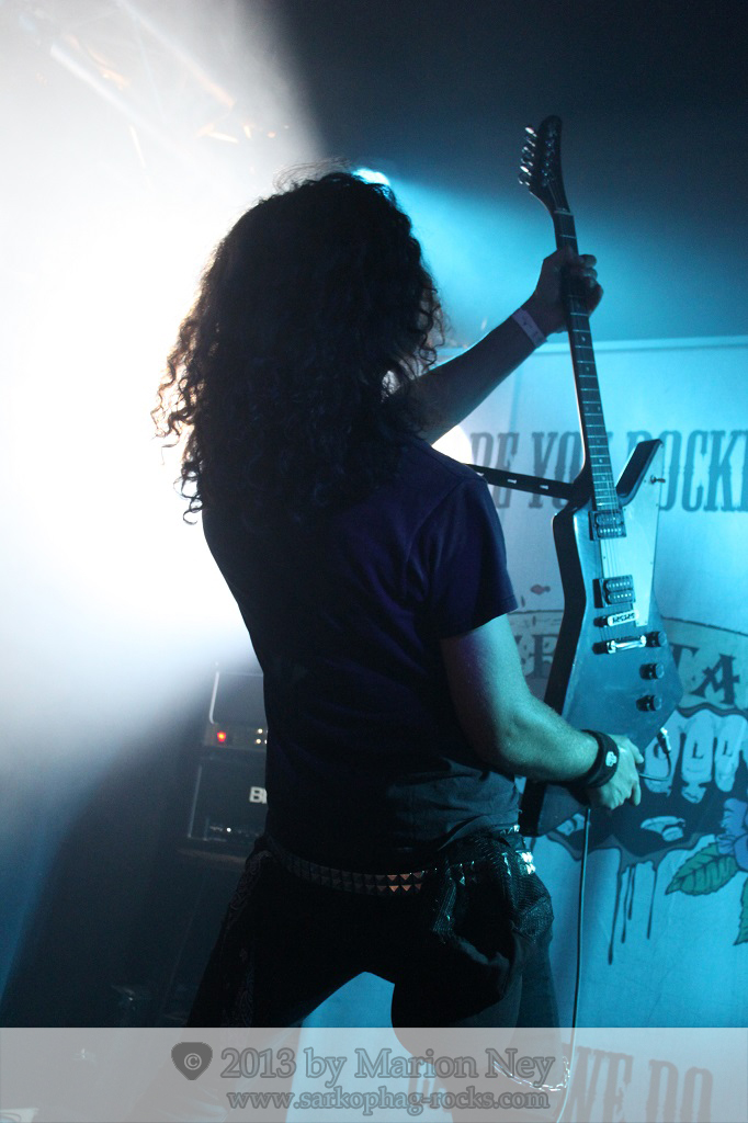 Bassist Deg war sehr aktiv, verharrte aber auch mal und zupfte seinen Bass irgendwie total abwesend, mit einem Blick als wäre er kurz in eine ganz andere Welt abgetaucht. Gitarrist Rob lieferte ansprechende Riffs und Soli, dazu eine wilde, energiegeladene Performance. Er tigerte auf seiner Seite der Bühne vor und zurück und oft sah ich nur noch Haare, viele fliegende Haare ;-) Bei Drummer Vanns flogen eher die Arme, er kloppte dynamisch und kraftvoll auf seine Felle und Becken, gab den Songs den richtigen Drive. Die Saiteninstrumentler sorgten auch für den Backgroundgesang, den sie mehr als passabel hinbekamen.
